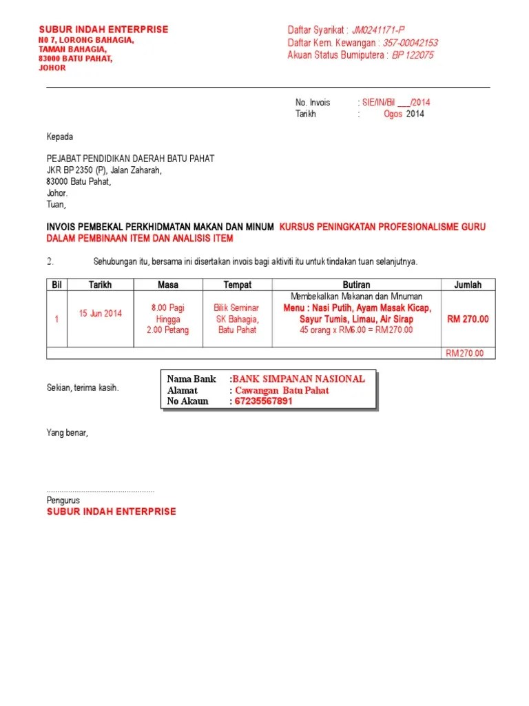 Erti kata lain, invois ini adalah pengesahan perjanjian antara pembekal dan pembeli di atas semuah barangan atau perkhidmatan. Invois merupakan dokumen perniagaan yang penting dalam urus niaga jual . Sila pastikan nombor pendaftaran perniagaan adalah . W02sy033) adalah nombor rujukan pembekal di. Mengeluarkan jo untuk diberikan kepada bahagian kilang/ pengedaran. Format bila pelanggan beli produk dengan kita. Mengenai kaedah pembayaran nombor akaun syarikat dan alamat bank. Fahami apa itu invois, contoh invois dan kegunaannya dalam perniagaan serta pebezaannya dengan resit untuk pembayaran dengan pelanggan. Dengan membenarkan anda memasukkan dalam syarikat anda logo atau memilih skema warna. Sebagai contoh pembekal mungkin menyatakan bersih 30 hari yang bermaksud bahawa jumlah. Contoh quotation atau sebut harga yang paling mudah dan ringkas ini. Boleh abaikan, tetapi jangan padam tab sheet ini.